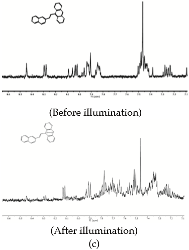 Synthesis and characterization of 9-[(E)-2-phenylethenyl]anthracene, PEA 1 and 9-[(E)-2-naphthylethenyl]anthracene, NEA 2. Commercially available starting materials and solvents were used without any additional treatment. PEA 1 and NEA 2were prepared by the Wittig reaction starting from benzyl bromide (reagent grade, Alfa Aesar) and 9-anthracenecarboxaldehyde (reagent grade, Sigma-Aldrich), and from 2-naphthylmethyl bromide (reagent grade, Alfa Aesar) and 9-anthracenecarboxaldehyde, respectively, in dichloromethane (Mallinckrodt Chemicals) following standard literature procedures (21, 22). The products were fully characterized by 1H and 13C NMR (Bruker Ultrashield 400, tuned at 400 MHz for 1H and 100 Hz for 13C) and ESI-MS (Agilent Series 1100 MSD, 50-3,000 m/z range). Signals of the products matched the spectroscopic data reported in the literature for the respective compounds (23).