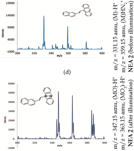 As seen in Figure 4(c) and 4(d), NMR and ESIMS experiments with NEA 2 gave rise to about the same results as with PEA 1. The 1 H-NMR spectrum of NEA 2 exhibits a signal at 8.45 ppm (s) that is assigned to the proton attached to C10, which is no longer present after a 300 min-period of exposure to visible light, presumably because it has moved up field from the aromatic region due to the addition of oxygen. Comparison of the ESI-MS spectra that were recorded before and after exposure to light indicates that ¹O2 has been incorporated to the molecule [Figure 4(d)]. The ESI-MS molecular ion is changed from m/z = 331.15 amu (corresponds to NEA 2 before illumination) to two ions of m/z = 363.15 amu and m/z = 347.15 amu which correspond to adducts with two and one oxygen atoms, respectively.