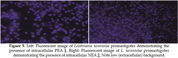 L. tarentolae parasites were incubated in the presence of either compound then washed to remove remaining compound in the medium. The results clearly demonstrate that both PEA 1 and NEA 2 can be found inside the parasites (Figure 5). These compounds appear to localize in non-identified cellular regions. It was found that PEA 1 gets inside Leishmania cells within 15 minutes while the NEA 2 uptake required about an hour.