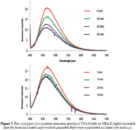 Both compounds at 10 uM concentration are efficient at inhibiting the growth of Leishmania promastigotes in vitro. Figure 6 shows parasite viability as the relative percentage of surviving parasites with respect to control cultures with no added compounds. It is clear that PEA 1 is an antileishmanial substance even in the dark, and that cells do not grow in the culture especially after light treatment. On the other hand, addition of NEA 2 does not exhibit such a strong antileishmanial effect in the dark or even after the first day of exposure to visible light; however by day 2 NEA 2 does exhibit photodynamic inhibition of parasite growth since no viable parasites are detected. This is in contrast to the growth, relative to control cells, seen on day 2 without light exposure. The contrasting photodynamic effect between day 1 and day 2 when comparing both compounds may be due to the dark toxicity of PEA 1. The antileishmanial activity of both PEA 1 and NEA 2 at day 1 is very similar, regardless of whether the parasites were exposed to light or not. However, exposure to light for a second day enhances the activity of the compounds. Both compounds are likely to produce reactive oxygen species, including singlet oxygen within the parasites. Indeed, PEA 1 and NEA 2 intracellular accumulation by parasites was examined by measuring their fluorescence directly in samples of cultures of parasites incubated with either compound in the absence of photosensitizer, and then washed to remove exogenous compounds. Cells were resuspended in heme free medium. In these experiments, emission intensity of intracellular PEA 1 and NEA 2 clearly dropped as a function of time of light exposure as shown in Figure 7. It is clear that singlet oxygen has been trapped by the compounds even in the absence of a photosensitizer, which implies that the compounds generate and trap this species upon absorption of violet light (around 400 nm).