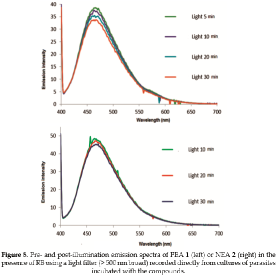 The results suggest that the photosensitizer RB is not very effective inside the cell at reducing the emission of trap compounds PEA 1 or NEA 2. This result may be rationalized in terms of the effectiveness of energy transfer inside the parasite, which seems to be diminished because of various factors such as: (i) the lack of spatial proximity inside the cellular environment; or (ii) extinction of ¹O2 that is generated by RB exerting a photodynamic effect in other intracellular species, such as protein, lipid, or nucleic acids, prior to its collision with the trap compound.