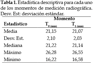 Recolección y procesamiento de la información: obtenidas las radiografías en T0 y T1, la información de los registros de recolección se digitó en una tabla matriz diseñada en Microsoft Excel (Redmond, WA, USA). Esta digitación contó con verificación periódica a fin de minimizar errores. Asimismo, la tabla matriz contó con copias de seguridad periódicas para evitar la pérdida de información.
