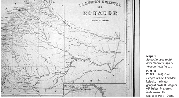 Por ejemplo, en 1884 Santiago M. Basurco publicó un mapa del país que fue prohibido por el gobierno para la enseñanza pública porque una gran parte de la provincia de Oriente, reivindicada como posesión histórica ecuatoriana, constaba como "terreno disputado por el Perú y Ecuador". Otro mapa que no obtuvo la aprobación oficial fue el mapa elaborado por Bernard Flemming3 editado en 1891. El gobierno invalidó este mapa, a pesar de tener mayores fundamentos científicos que el anterior, porque planteaba diferencias con las posiciones oficiales sobre los límites del país. Pero a pesar de este control del Estado sobre los contenidos de los mapas, seguimos dentro del campo del espacio reivindicado y no del espacio efectivo. El mapa que finalmente se publica en 1892 es el mapa de Theodor Wolf. En las siguientes secciones hablaremos sobre la manera ambigua en la que Wolf asume el problema de los límites con las repúblicas vecinas.