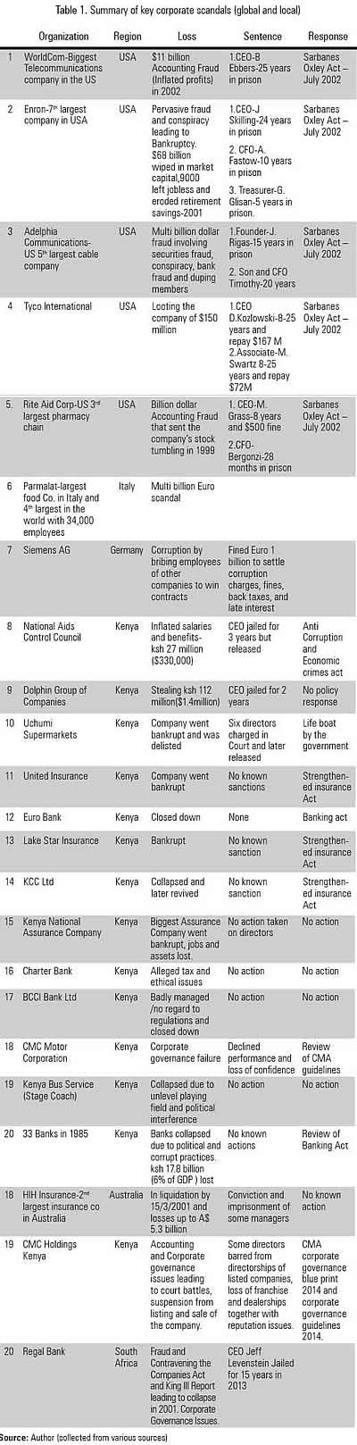 Lessons from around the world on the magnitude of losses and their impact on society do prove the need to ensure no more governance lapses. While the list depicts direct losses, others including the reputation of the firms involved shouldn't be overlooked. Some of the reasons cited for these failures include lapses in auditing, hiding loans or losses, insider trading and inflated revenue. The New York Times on 16/6/2002 listed top institutions including Arthur Andersen, Delloite & Touché, Ernst and Young, KPMG and PWC alongside other corporations. This section summarizes some of the consequences of corporate failures and scandals both in and outside Africa (See Table 1).