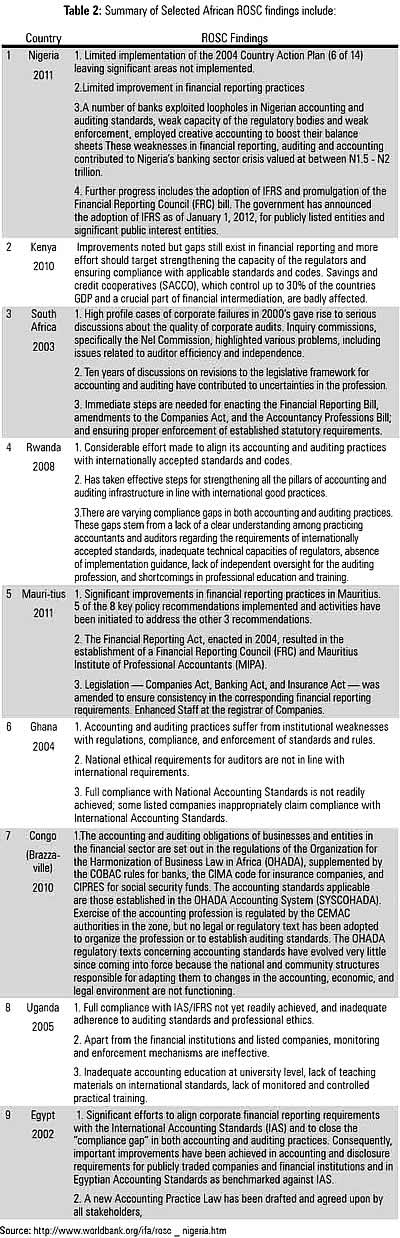 It can be seen that throughout Africa, weak capacity of regulatory bodies, weak monitoring and enforcement, lack of independent oversight of the auditing profession and general institutional weaknesses cut across the continent weakening financial reporting and attendant investor confidence.