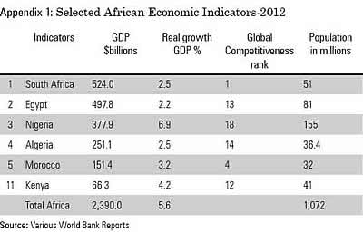 The African case is important. Questions have been raised as to whether Africa is still a dark continent given the continuing increases in foreign direct investment (the highest in any developing region), the recent hosting of the World Cup in South Africa and the discovery of oil and gas in Uganda, Kenya and Tanzania. It is estimated that Africa's GDP in 2008 stood at $1.6 trillion, equivalent to that of Brazil and Russia. The McKinsey quarterly report (2010) indicated that about half of Africa's 1 billion populations will live in cities in 2030. 18 top cities in Africa will have a combined purchasing power equal to 8% of the total Africa GDP. Since 2005 GDP growth on the continent has averaged 5.1% and the World Bank and many other development institutions have recognized Africa as the area for growth given Europe and the US are not registering major growth projections. Moreover, oil, gas and other minerals continue to be discovered in the continent while service industries are now major part of the GDP. The five top economies include South Africa, Nigeria, Egypt, Algeria and Morocco while the fastest growing ones include Ethiopia (7.5%), Mozambique (7.2%), Tanzania (6.8%), Congo (6.5%), Ghana (9%) and Zambia (7.6%) in 2013 see appendix 1 and 2. Even though growth rates in Africa have been criticized as excluding equity and wealth distribution, this unequal distribution mars progress and has been a source of many upheavals. Some corporate leaders have suggested that African economic growth will not be sustainable if the continent does not improve its reputation for corporate governance (Ramalho, 2013) and that Africa's growth will be real only if it develops strong companies able to compete successfully in their home and overseas markets and that is best achieved through good corporate governance. Keeping Africa on governance trajectory is therefore timely as the anticipated and currently dismal wealth situation needs to be managed well and in the best interest of society so as to reach the predicted middle-income status by 2050.