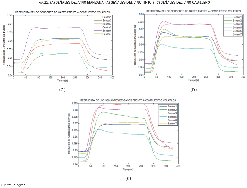 En la Fig. 12 (a), Fig. 12 (b) y Fig. 12(c) se observan cada una de las señales filtradas de los tres diferentes tipos de vino. Las respuestas de los sensores fueron adquiridas en señales voltaje mediante un circuito divisor, el cual se realizó el cálculo de dichas señales en valores de resistencia del sensor (Rs), y a su vez, fueron convertidas en valores de conductancia (1/Rs). Esto fue importante ya que a estos valores de amplitud fueron más adecuados para realizar el procesamiento de cada una de las medidas.