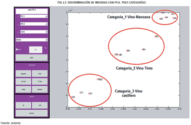 Al conjunto de datos adquiridos se aplicó el algoritmo de PCA dando como resultado una diferencia notable en la agrupación de cada categoría, permitiendo observar la repetitividad y selectividad de la nariz electrónica (ver Fig. 13). Tomando como base lo anterior, los datos obtenidos fueron utilizados para clasificar los tres tipos de muestras, teniendo una correcta discriminación de las medidas de los tres tipos de vinos (es decir, manzana, tinto y casillero). Las agrupaciones demuestran la variación del conjunto de datos en un plano de dos dimensiones.