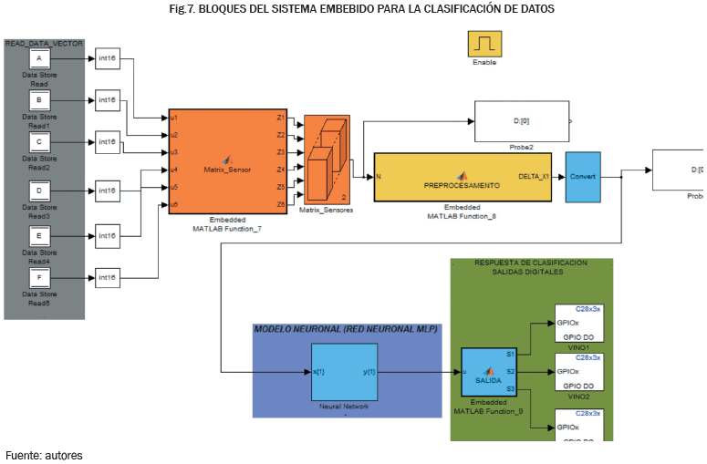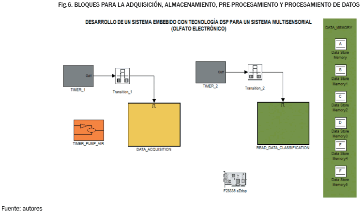 Tal y como se mencionó anteriormente, el propósito de este proyecto fue realizar la implementación del algoritmo de la red MLP en forma embebida, a través de la tecnología DSP. Asimismo, también se implementaron diferentes bloques de programación para la adquisición, almacenamiento, pre-procesamiento y procesamiento de datos, ya que fueron necesarios para obtener un sistema que no dependiera completamente del computador al momento de clasificar los compuestos volátiles. Todo esto fue posible implementarlo en la DSP, tal y como se ilustra en los diferentes Bloques del simulink previamente configurados (ver Fig. 6).