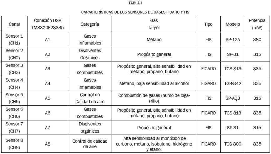 Como primera medida, los sensores utilizados fueron de óxido de estaño de la casa FigaroInc y sensores FIS de las series SP y ST. En la Tabla I se describen cada uno de los sensores de gases utilizados en el sistema de medida. Tal y como se observa en la tabla I, se especifica cada canal donde se realizó el acondicionamiento eléctrico del sensor. A su vez se describe el tipo de gas a detectar, como el consumo de potencia de cada uno de los dispositivos.