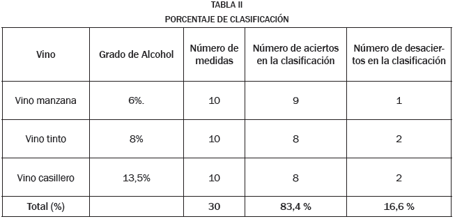 Después de realizar diferentes pruebas experimentales (10 medidas) con las tres categorías de vinos seleccionados, se registraron los aciertos y desaciertos en la clasificación de medidas (ver Tabla II), con el propósito de obtener un porcentaje que permitiera determinar la respuesta de la nariz electrónica, mediante el procesamiento con la tecnología DSP. En la tabla II es posible observar que el porcentaje de aciertos es mayor, pero con un valor del 16.6 % en los desaciertos.