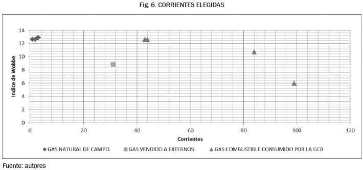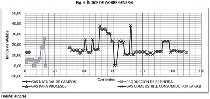 A las corrientes seleccionadas se aplicó la evaluación del Índice de Wobbe, a partir de lo cual se apreció la alta variabilidad de resultados que pueden afectar de manera negativa la combustión. La Fig. 4 muestra el cálculo de este índice a las corrientes evaluadas.