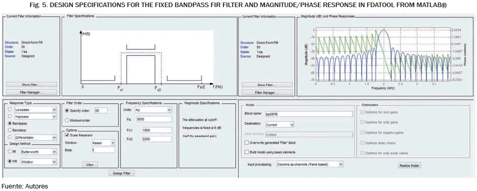 Fig. 2 shows a block diagram structure for the Identification System, which uses an adaptive FIR filter to identify an unknown system. The unknown system to be identified is a BandPass FIR filter with 50 coefficients centered at 2 kHz. The coefficients of this fixed FIR filter are obtained from the filter design realized with the FDATool platform from Signal Processing Toolbox of Matlab®. These coefficients are generated and read from the filter block from Simulink® in Matlab®.