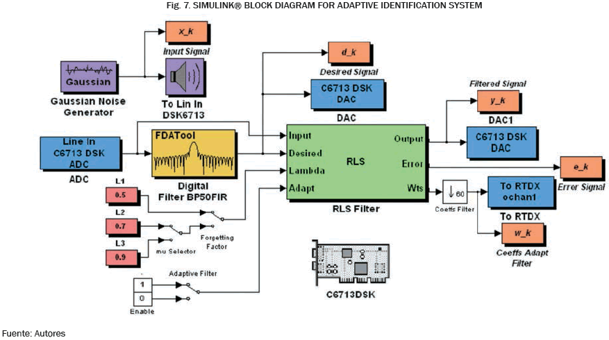 Simulink® includes the interface library for platform development DSK C6713 DSP, and allows to link the signals from Simulink® block diagrams to the identification system model (White Gaussian Noise and FIR Filter response). In summary, the implementation method of adaptive algorithm in the DSK platform involves the following steps [30], [36]: