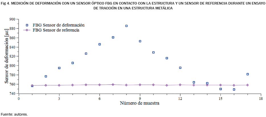 Como ya se ha mencionado, la longitud de onda reflejada por un sensor FBG depende directamente, tanto de la temperatura en el entorno de la fibra como de la deformación a la cual es sometida. La longitud de onda reflejada por una red de difracción de Bragg contiene información de los dos fenómenos. Existen diferentes métodos por medio de los cuales se logra la discriminación de cada una de las variables sobre la longitud de onda de Bragg (cita requerida), el más sencillo y a la vez uno de los más eficaces es el método de discriminación me diante un sensor de referencia, en este método se aísla una FGB de manera que solo sea afectada por una variable, generalmente la temperatura, de esta manera, se tiene la información de la temperatura en un solo sensor y se puede compensar la medida de los demás sensores. En la Fig. 4 se observa el resultado del uso de este método para comprobar que el efecto de la temperatura, por ser de una dinámica más lenta que el efecto de la deformación durante un ciclo de carga y descarga del experimento, no afecta la medida obtenida.