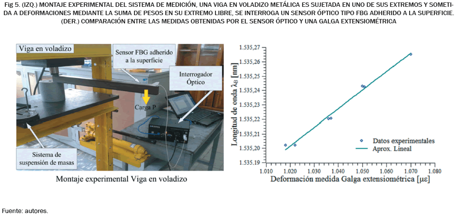 La caracterización de los sensores ópticos tipo FBG se llevó a cabo mediante comparación directa de su respuesta en el dominio óptico contra las medidas obtenidas por galgas extensiométricas, las cuales son sensores de tipo eléctrico usados convencionalmente. El experimento realizado para caracterizar inicialmente los sensores ópticos se conoce como 'viga en voladizo,' consiste en sujetar un extremo de una viga metálica y agregar peso progresivamente en su extremo libre obteniendo una deformación en la viga en intervalos discretos. La deformación en este experimento se acentúa en el extremo empotrado de la viga, es allí donde los sensores tanto eléctricos como ópticos son ubicados para medir la deformación a la cual se somete la estructura cada vez que se incrementa el peso en su extremo libre.