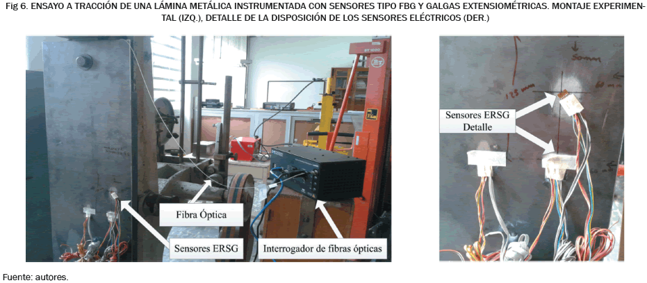 El experimento se realizó con una varilla estructural de 60 cm de largo y un diámetro de 10 mm. Sometida a varios ciclos de tensión a lo largo de su eje en su zona elástica en donde la fuerza aplicada varía entre 0 y 33 kN. Los ensayos se realizaron en el laboratorio de análisis de materiales de la Facultad de Ingeniería de la Universidad Nacional de Colombia. La máquina se adecúa al tamaño de la muestra y se aseguran las mordazas que ejercen la tensión, se deben tener en cuenta ciertas precauciones para que los sensores queden libres y no se ejerza presión sobre ellos. En la Fig. 8 se observa la disposición de los sensores (izquierda), en esta imagen se identifican los sensores eléctricos y se debe tener en cuenta que la fibra óptica se adhiere en la parte posterior de la varilla, justo detrás de la galga extensiométrica. A la derecha de la Fig. 8, se tienen los datos obtenidos por cada uno de los sensores durante un ciclo de incremento de la fuerza ejercida en la estructura, en esta gráfica se tiene la longitud de onda reflejada por el sensor FBG y las deformaciones medidas por los sensores ERSG y extensómetro contra la fuerza ejercida en la estructura.