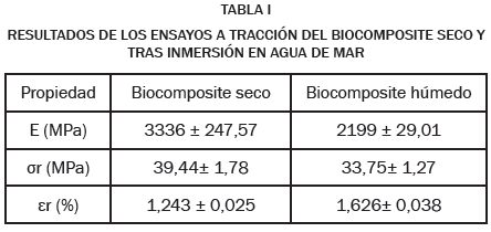 En la Tabla I se pueden observar los valores de: módulo elástico (E), tensión de rotura (σr) y deformación de rotura (εr), de las probetas ensayadas a tracción de biocomposite seco y tras inmersión en agua de mar.