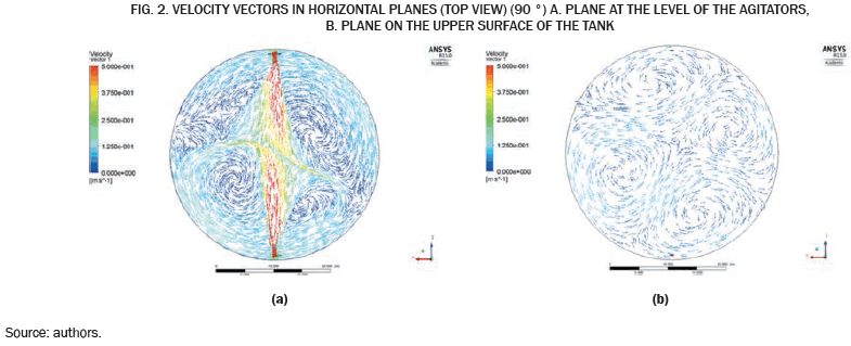 The tank presents velocities below 0.1 m/s (69.42% of its volume), where 39.72% are lower than 0.05 m/s and only 30.58% of the tank is above 0.1 m/s, which is concentrated around each impeller. The low velocity zones represent the 9.33% with velocities below 0001 m/s. At the level of the agitators only 41.35% have velocities above 0.1 m/s, where included areas are near the agitators and the walls. About 1.35% are values with velocities below 0001 m/s, very close to zero. At the top of the tank, the case is different, speeds are not higher than 0.1 m/s. Most of the oil in this plane have speeds below 0.05 m/s.