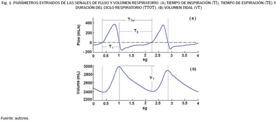 Para cada señal de flujo respiratorio correspondiente a un paciente se evaluaron los siguientes parámetros: duración del ciclo respiratorio (TTot=TI+TE), tiempo de inspiración (TI), tiempo de expiración (TE), el volumen circulante o volumen tidal (VT), la fracción inspiratoria (TI/TTot), el flujo inspirado medio (VT/TI) y la relación frecuencia-volumen tidal (f/VT). La Fig. 1 presenta los parámetros extraídos de las señales de flujo y volumen respiratorio para el estudio.