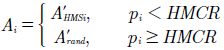 SiendoA i una armonía,p i un valor aleatorio entre 0 y 1,A’ HMSi una armonía en la memoria armónica con posibles modificaciones, yA rand un acorde aleatorio.
