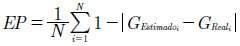 El primer indicador, la exactitud pura (EP), es el valor que describe el éxito de clasificación del sistema sin un umbral definido. Mientras mayor sea la diferencia entre las salidas obtenidas (género estimado), y las esperadas (género real), la exactitud pura es menor. Se define mediante la ecuación (18).