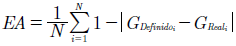 El segundo indicador, la exactitud aproximada o de acierto (EA), a diferencia de la exactitud pura, utiliza el género definido que utiliza un umbral para clasificar la salida como masculina o femenina. El género definido se calcula mediante la ecuación (19).