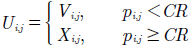 Los elementos con un valor menor a la tasa de cruce (CR) toman el valor respectivo del vectorV.Los elementos restantes, con un valor aleatorio mayor o igual a la tasa de cruce, permanecen sin cambios. El valor de cada parámetrojen cada vectorise muestra en la ecuación (3).