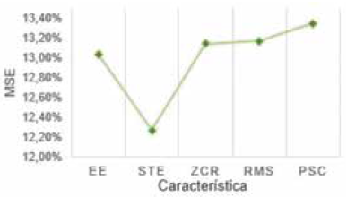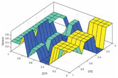 El modelo obtenido de mejor desempeño se obtuvo con algoritmos genéticos en el modelo número 1, tuvo un MSE del 10% y logró una exactitud pura cercana al 88%. Las entradas de mayor influencia para el éxito de clasificación son EE, STE y ZCR.