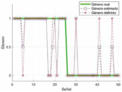 Los valores de género real y género definido son enteros, donde 1 representa el género masculino, y 0 representa el género femenino. El valor de género estimado tiene un valor real que oscila entre estos valores.