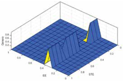 El primer modelo utiliza las tres primeras entradas definidas en la Sección 4. Las figuras 16, 17 y 18 muestran los valores que conforman la superficie de salida en función del valor de cada par posible de entradas.