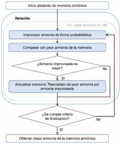 El diagrama de flujo que describe el funcionamiento del algoritmo de búsqueda armónica se muestra en la Fig. 2.