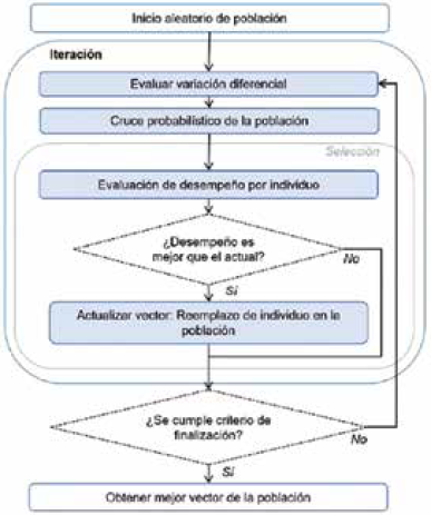 El diagrama de flujo que describe el funcionamiento del algoritmo de evolución diferencial se muestra en la Fig. 3.