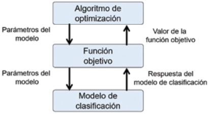 La evaluación de un individuo en el proceso de optimización con un algoritmo se hace mediante la construcción de un modelo difuso con los parámetros del individuo y la estructura definida en la función objetivo. Esta función es calculada con las respuestas de clasificación del modelo construido. La Fig. 6 muestra el esquema general que el algoritmo de optimización utiliza para la evaluación de los individuos, siendo el modelo de clasificación un modelo difuso de los 16 propuestos.