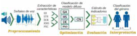 La aparición y evolución de enfoques de clasificación que utilizan modelos de lógica difusa, redes neuronales artificiales, redes adaptativas de inferencia neurodifusa o aprendizaje automático en sistemas de control ha generado numerosos estudios e implementaciones en sistemas de detección, reconocimiento o clasificación. Se han propuesto modelos de redes neuronales 10), (13), (17, algoritmos genéticos 2, sistemas de inferencia neurodifusa (ANFIS) 3, y máquinas de soporte vectorial (SVM) 6 con el fin de clasificar con un margen de error bajo el género de una señal de voz humana. En este artículo, la clasificación se realiza mediante la aplicación de algoritmos de optimización a modelos difusos.