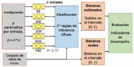 En este trabajo se presenta un esquema implementado en Matlab®, en el que se prueban 16 diferentes modelos de inferencia difusa (modelos difusos) de clasificación de género, los cuales se diferencian principalmente en la cantidad de entradas y los tipos de entrada especificados.