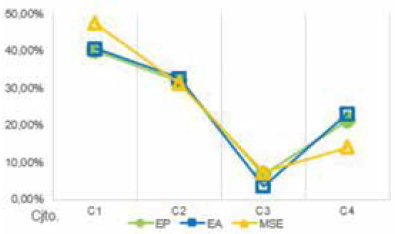Se busca que el MSE sea el mínimo posible. Si este valor es menor, los indicadores de exactitud tienden a ser mayores y los resultados obtenidos (géneros estimados) se aproximan a los deseados (géneros reales).