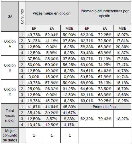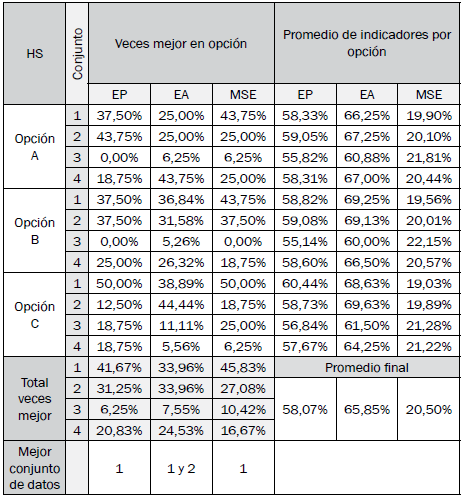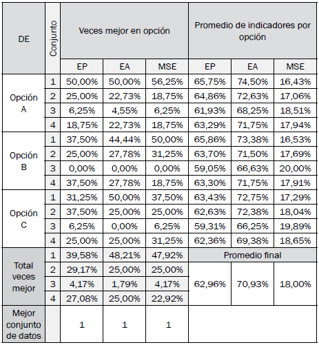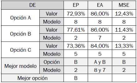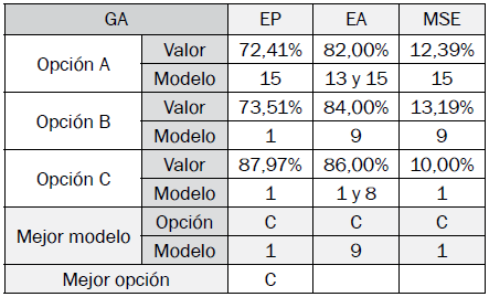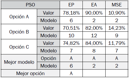 Los resultados de los mejores modelos difusos de clasificación optimizados encontrados por opción en cada algoritmo son especificados en las tablas VII a X, y se determina la mejor opción y modelo con base en sus indicadores de desempeño.