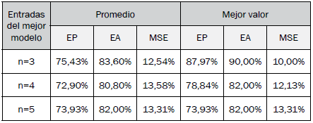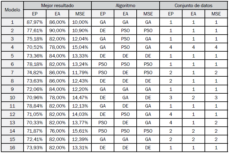 Los mejores resultados por modelo se muestran en la Tabla XI, con el algoritmo bioinspirado y conjunto de datos utilizado para lograr cada uno de sus indicadores. La Tabla XII muestra los resultados promedio por número de entradas y la Tabla XIII muestra los resultados promedio de los modelos con una entrada en común.