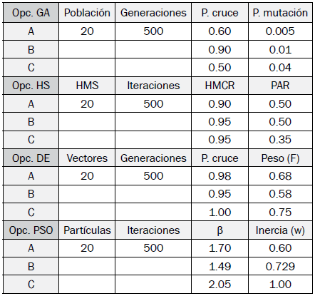 Las mejores opciones para los algoritmos GA, HS, DE y PSO son las opciones C, C, B y A, respectivamente.