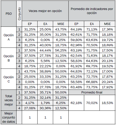 En esta Sección se lista una serie de tablas y gráficas con los resultados de indicadores de desempeño, en las que se establecen los mejores conjuntos de datos y modelos por algoritmo bioinspirado.
