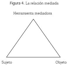 Relación mediada por herramientas/aparatos/instrumentos. Este gráfico explica que la relación básica entre sujeto & objeto, no es directa, por ello la línea punteada (Martínez, 2006).