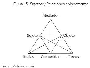 En la figura 5, el tejido de relaciones es más variado: el sujeto interactúa con sujetos colectividad con el propósito de llevar a cabo una actividad a partir del trabajo compartido, colaborativo. En términos de Martínez, este gráfico ilustra las relaciones en el proceso de enseñanza-aprendizaje en contexto de interacción en línea.