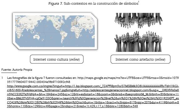 La segunda interacción se refiere al producto de la cultura, con un significado según su uso, con representaciones mediáticas; hace alusión a los contactos cara a cara en el espacio físico, personas con rasgos etnográficos concretos, con metas y gustos contextualizados. Entre ambos escenarios se crean múltiples y variadas referencias materiales y simbólicas. Sugerimos la convergencia de estos dos sub-contextos, tal y como se aprecia en la figura 7.