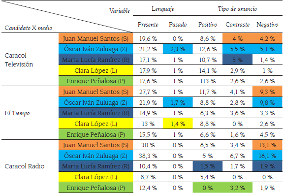 Los porcentajes más altos en los tres medios de comunicación para ambos candidatos, utilizaron lenguaje en presente, sin desconocer que, en Caracol Televisión, Zuluaga presentó noticias con lenguaje en pasado mientras que las de Santos fueron todas en presente. Por parte del periódico El Tiempo y Caracol Radio, Santos es quien tiene mayor porcentaje de noticias en pasado frente a las noticias en pasado de Zuluaga. No obstante, aunque las noticias en pasado se definen con tendencia a ser negativas, en la variable de tipo de anuncio, es Zuluaga quien presenta los porcentajes más altos de noticias negativas en los tres medios de comunicación, frente a los resultados de su homólogo.