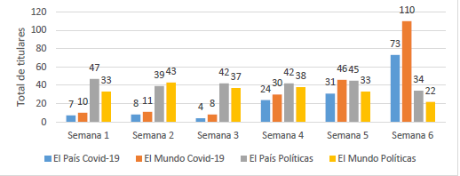 En el estudio de Núñez et al. (2020), se afirma que la pandemia del Covid-19 se ha enfocado en las portadas en tres temáticas fundamentalmente. Por orden de importancia, las temáticas son sanidad, política y economía. En comparación con el análisis llevado a cabo, en los titulares del período analizado en El País y El Mundo, las temáticas predominantes son las de avance del virus e internacionales, mientras que las tres temáticas citadas anteriormente ocupan los tres últimos lugares por orden de relevancia.