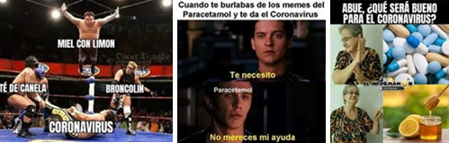 El anuncio y recepción de la pandemia en México a través de los memes fue con miel y limón, broncolin y paracetamol, además de remedios caseros de la abuela, naturales y tradicionales, ancestrales y empleados en la actualidad. Los memes acerca de cómo algunas autoridades tomaron una posición prudente y tranquilizadora en ese primer momento. El humor benigno (Freud, 2008b) con función social, regulador emocional y de tipo afiliativo (Martin, 2007) que, no obstante, aconseja con cierta visión de la medicina y los tratamientos, conformando ideas y conductas (Shifman, 2014; Knobel y Lanskshear, 2007). Quién sabe si, con intereses comerciales detrás (Cortázar, 1014), o simplemente creación anónima, participativa y popular. En todo caso, muestran un estado de ánimo inicial aparentemente distendido, a pesar de las imágenes de lágrimas o luchas, textos para compartir remedios y cierta diversión.
