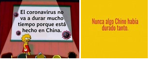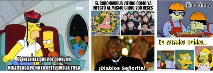 De la espera en México al origen chino. La historia oficial de la ya famosa sopa de murciélago suena a storytelling y al ubicarse en Wuhan, una ciudad China, todo lo relacionado con ese país entró de lleno en el humor, como el acento chino de los Simpson, personajes y caricatura muy empleados por cierto por los memes como parte de la cultura mediática que emplean y transmiten, entre pop, industrias culturales y cultura popular.