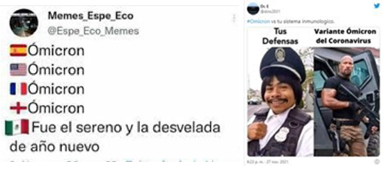 De nuevo, la presentación del país comparándose con otros y afrontando la noticia del Ómicron con humor. En apariencia no parece tomarse tan en serio la nueva cepa, pues mientras otros países la declaran grave, México la confunde y asume como consecuencia de extralimitarse en las festividades de año nuevo. Tal vez resiliencia como evasión o resemantización (Vanistendael, 2010). En todo caso, un humor ligero, en parte benigno, quizás incongruente, eso sí, alivia seguramente (Freud, 2008b; Martin, 2007), como teoría y función. Es un humor que no desestima la crítica social y política del asunto (Ziv, 1984), que, incluso, ataca indirectamente o no del todo manifiestamente ciertas políticas sanitarias o determinadas respuestas de la gente, con un estilo descalificador y en parte agresivo (Martin, 2007). Se hace con ironía, diciendo algo sin decirlo, es desaprobación indirecta, denuncia de hechos con una burla encubierta (Armendáriz, 2005; Ramírez, 2005). Aunque dentro de lo ambiguo y polisemántico, también expresión de ideas y desahogo de emociones, sin otra pretensión más allá de lo explícito.