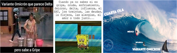 Estos memes y este humor prosiguieron siempre o casi siempre informando de la peligrosidad de Ómicron —no siempre corresponde esto con lo que la autoridad sanitaria decía—, muchas veces de forma graciosa, en general con un mensaje de advertencia y amenaza, como las iniciales del SARS-CoV-2, en sentido de construcción o reproducción ideológica sanitaria y visión del mundo oficial global. Lo cual puede interpretarse como documento de la vida real o creación de contenido (Shifman, 2014). Discurso anónimo y popular compartido por el meme desde el humor afiliativo de cohesión de identidad, o agresivo inspirado en el miedo desde la superioridad (Martin, 2007).